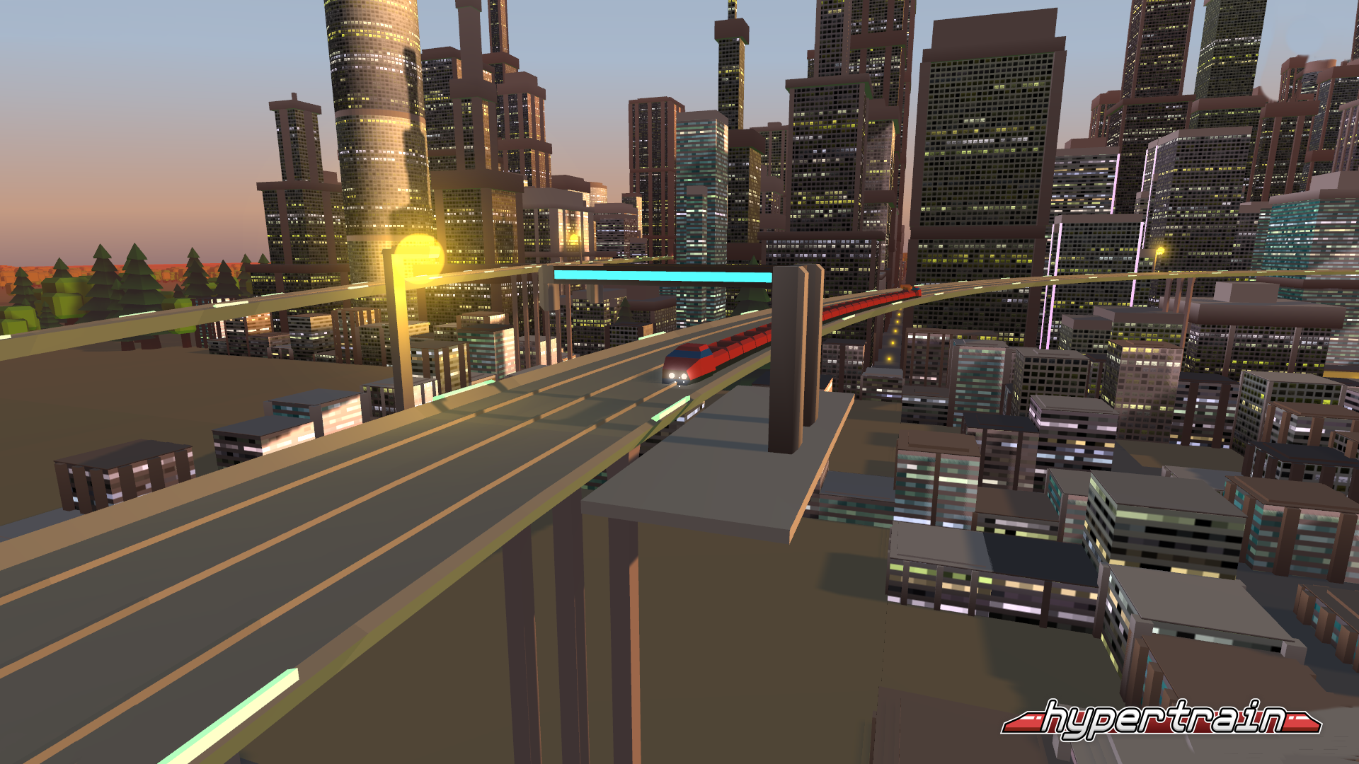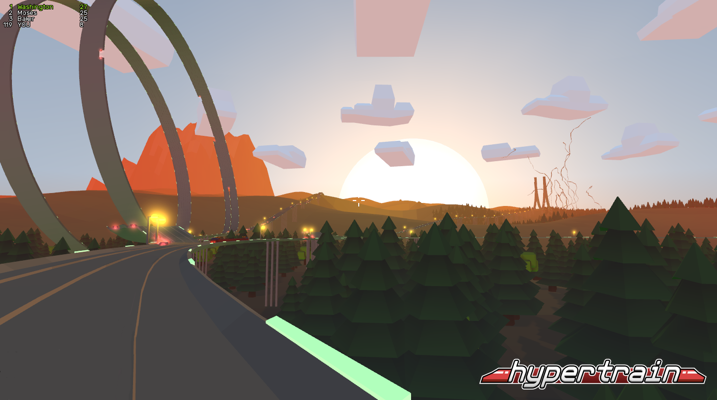 Control a high-speed (1000kmph) bullet train across a dangerous rail network consisting of crazy loopings, corkscrews and such. Work as an honest transporter and earn your income by transporting goods and people between cities while defending yourself against packs of Marauders. Use your cash to upgrade your train with more wagons and abilities. Claim and upgrade cities to boost your income. Or ... choose the pirate path and rob your way towards victory. The first hypertrain to reach 50 wagons wins.
